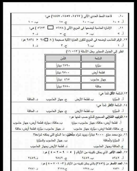 نماذج الاختبار الوطني لضبط النوعية لمادة الرياضيات للصف الثالث الفصل الثاني منتديات صقر الجنوب
