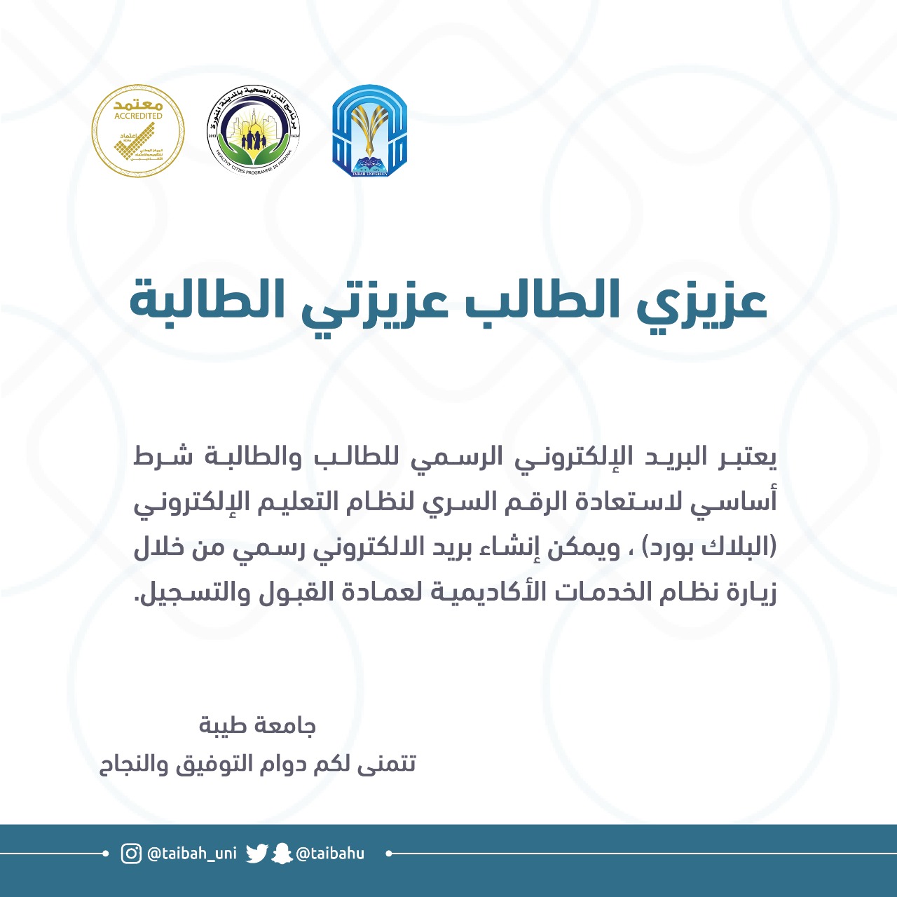جامعة طيبة Taibah U On Twitter عزيزي الطالب عزيزتي الطالبة يعتبر البريد الإلكتروني الرسمي للطالب والطالبة شرط أساسي لاستعادة الرقم السري لنظام التعليم الإلكتروني البلاك بورد ويمكن إنشاء بريد إلكتروني رسمي من