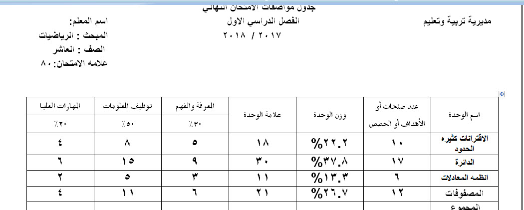 نموذج Word جدول مواصفات الإختبار النهائي لمادة الرياضيات الصف العاشر الفصل الأول منتديات صقر الجنوب